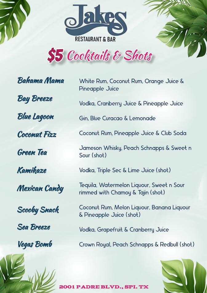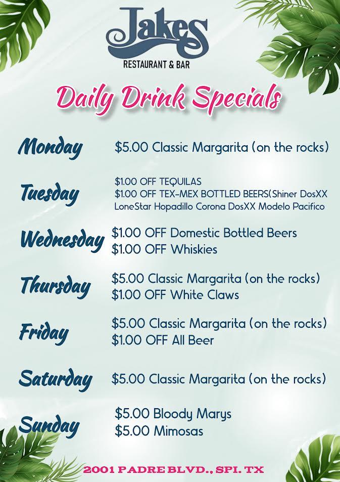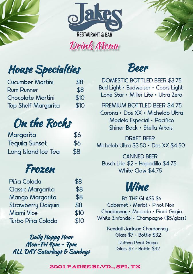 Welcome to Jake's Restaurant & Bar, your go-to spot on South Padre Island for a delicious dining experience in a clean and vibrant atmosphere. Enjoy a diverse menu featuring breakfast, lunch, and dinner options, along with an impressive full bar offering excellent cocktails and a wide selection of local beers. With seven big-screen TVs, you can catch all the sports action while relaxing on our boulevard deck or indoors. Whether you're dining solo or with friends, our friendly service ensures a delightful meal. Join us for memorable happy hour specials and live concerts, all while enjoying accessible facilities and a welcoming environment.